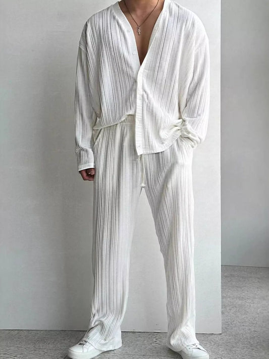 Men's Full Size Textured Button Up Shirt and Pants Set Plus Size