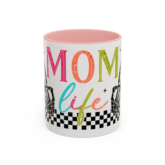 Mom Life Coffee Mug — Colorful Retro Checkerboard & Skeleton Peace Design (11/15oz)